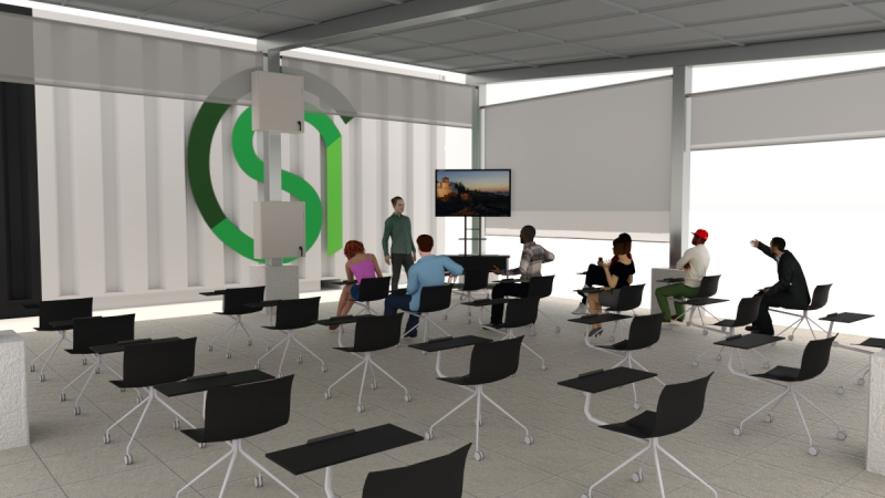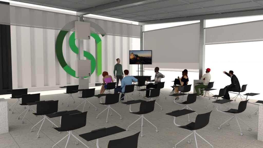 Weather resistant solar roof and motorized shades block UV light, wind, and rain to allow protected year-round use. Integrated electrical outlets, overhead lighting, and internet connectivity ensure that indoor amenities and digital teaching tools can be used in this space.
